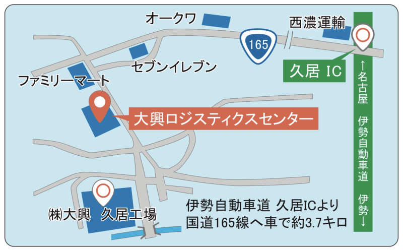 購買・調達サービス 本社 資材・購買 2024年11月 Taikoh Logistics Center 完成 大興ロジスティクスセンター 〒514-1255 三重県津市庄田町3596-1 敷地面積 3,110.99 ㎡ 941.07 坪 建築面積 1,465.20 ㎡ 443.22 坪 空調倉庫 温度 20℃~30℃湿度 60%以下 伊勢自動車道 久居ICより 国道165線へ車で約3.7キロ